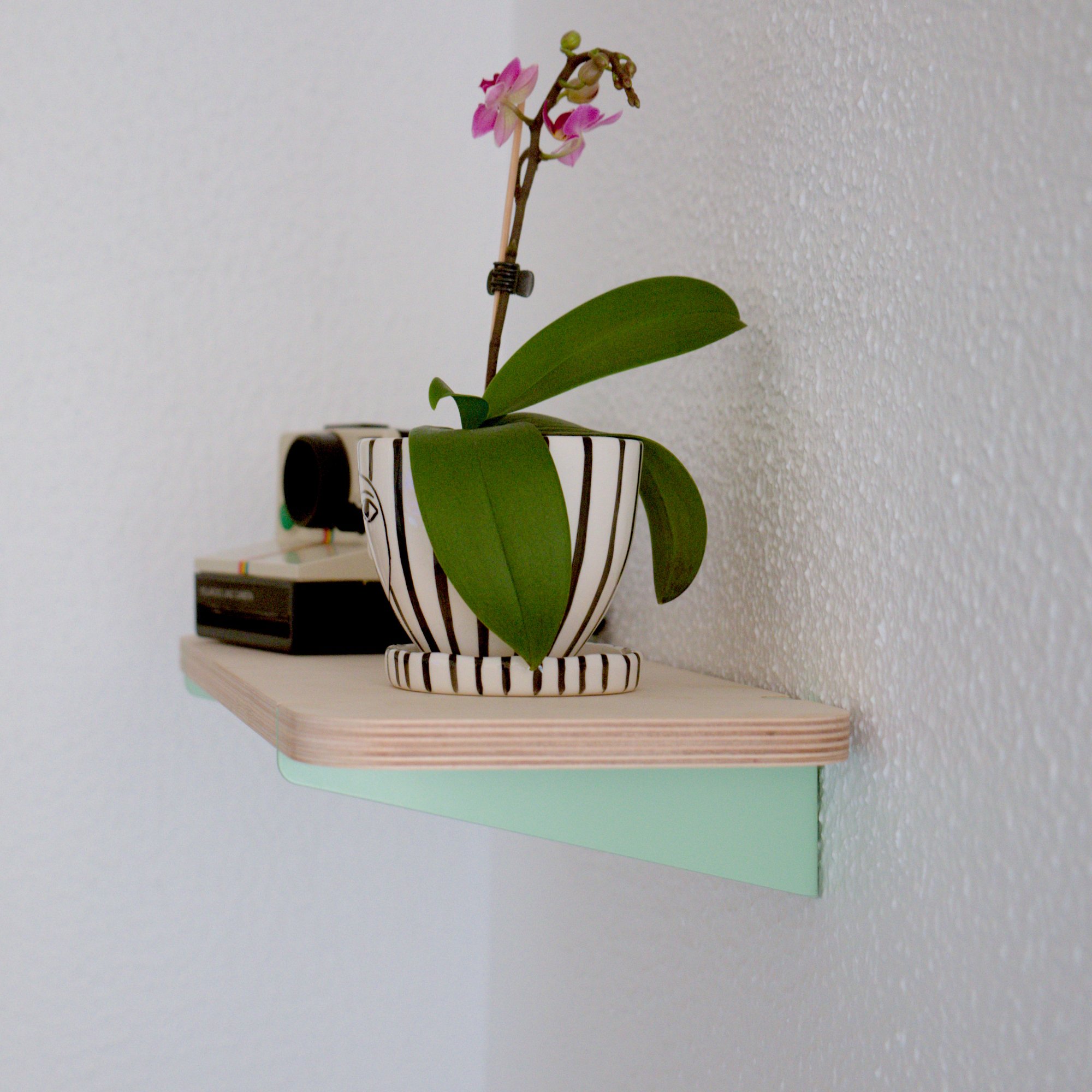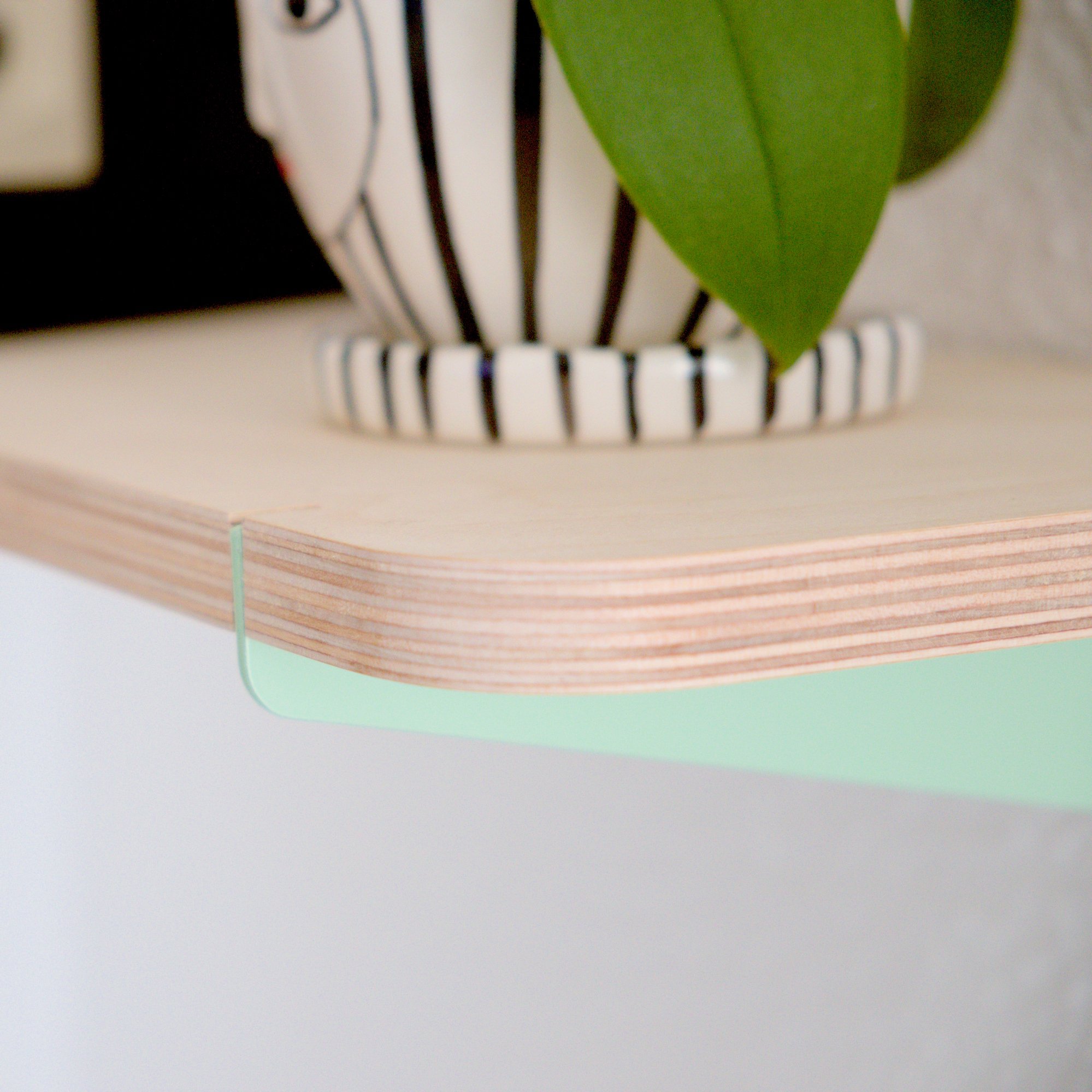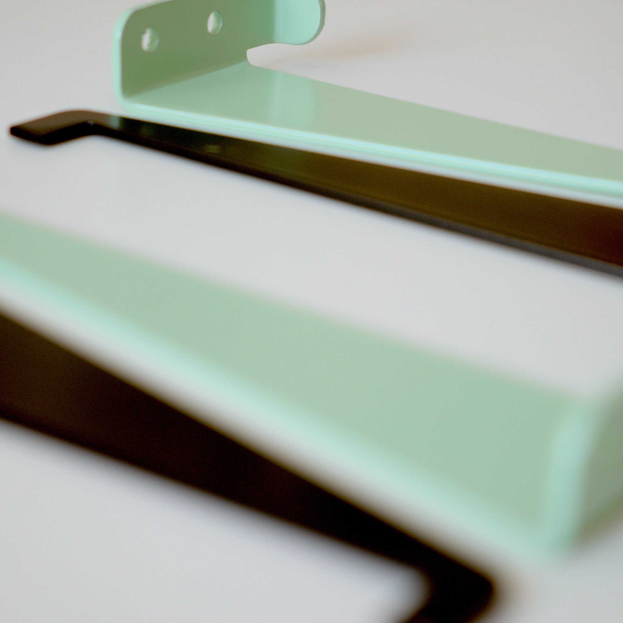 The brackets are made of sheet metal and finished in powder coating in 2 different colors. The shelf is 15 mm berch multiplex.
